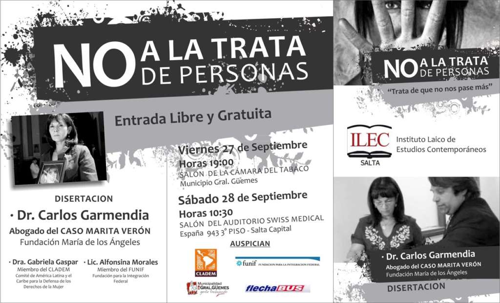 Desarrollaremos la disertación “No a la Trata de Personas” desde la 10:30 hasta las 12:00 hs., en España 943 3º piso, y las mismas serán dictadas por la Dra. Gabriela Gaspar, representante de CLADEM (Comité de América Latina y el Caribe para la Defensa de los Derechos de las Mujeres),  la Lic. Alfonsina Morales de FUNIF(Fundación para la Integración Federal), y como principal expositor el Dr. Carlos Garmendia, perteneciente  a la Fundación María de los Ángeles  y abogado de Susana Trimarco.FOLETO ILEC