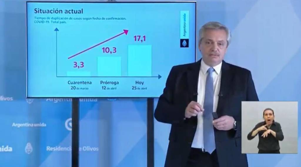 El presidente Alberto Fernández anunció anoche la extensión del aislamiento social preventivo y obligatorio por el coronavirus hasta el 10 de mayo, indicó que en las ciudades con más de 500 mil habitantes «seguirá como hasta ahora» y que en aquellas con menos población los gobernadores podrán decidir excepciones, y dispuso que, en todo el país, se podrán hacer salidas de una hora «con fines de esparcimiento» y de un radio no mayor a 500 metros del domicilio.
