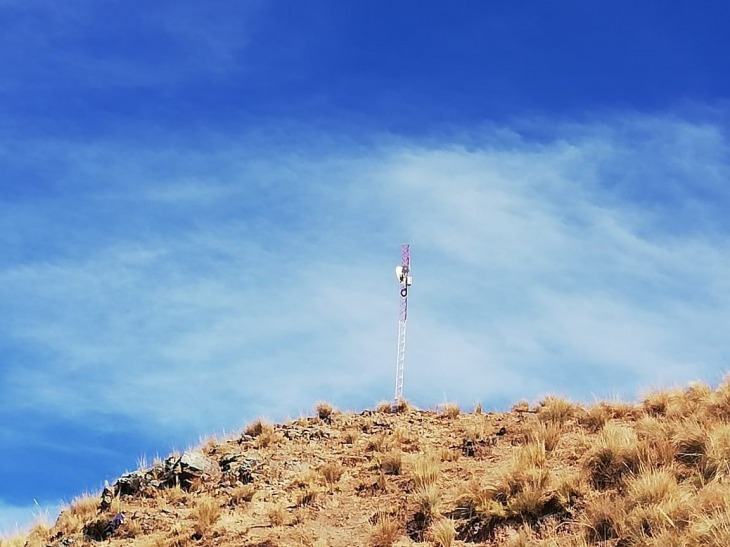 La torre está ubicada sobre un cerro a 3.600 mts. sobre el nivel del mar, cuenta con un sistema de energía solar, compuesto por tres paneles solares de 60W, regulador y banco de baterías de uso solar y libre mantenimiento. Tiene 12 mts. de altura, compuesta por cuatro tramos de 3 metros. Torre liviana 12/8. Con herrajes y riendas galvanizadas. En enlace es capaz de traficar 70Mbps (Simétricos).