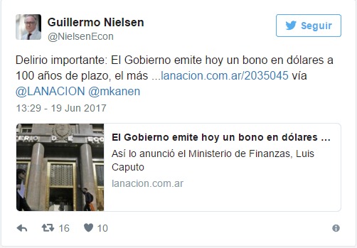 «Delirio importante: El Gobierno emite hoy un bono en dólares a 100 años de plazo», disparó el exsecretario de Finanzas Guillermo Nielsen vía Twitter, a poco de conocerse la novedad comunicada por el ministerio de Finanzas que conduce Luis Caputo y que sería el bono más largo de la historia de la Argentina a terminar de pagarse en 2117.