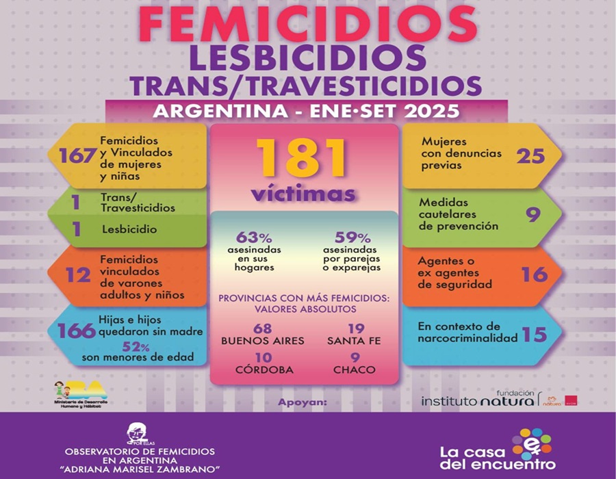 Desde el 1° de enero al 30 de septiembre de 2025, se produjeron 167 femicidios y vinculados de mujeres y niñas, 1 lesbicidio, 1 transfemicidio y 12 femicidios vinculados de varones adultos y niños, según un nuevo informe del Observatorio de Femicidios en Argentina “Adriana Marisel Zambrano” que dirige La Casa del Encuentro.