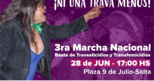 Como en todo el país, en Salta se llevará a cabo la 3° Marcha Nacional" Basta de Travesticidios y Transfemicidios".Uno de los sectores más vulnerados de la sociedad, la comunidad trans, saldrá a la calle, una vez más, a exigir por sus derechos.En una provincia donde se les niega la Ley de Cupo Laboral Trans,detenida en la Cámara de Diputadxs, por falta de consenso para tratarla y un municipio que derogó por ordenanza, la Dirección de la Diversidad Sexual.La provincia cuenta con una "Mesa de la Diversidad"espacio desde el que se apoya, esporádicamente,algunas actividades del colectivo LGBTIQ, pero sin estatus para generar políticas públicas.Se suma a eso, la violencia policial que descarga su odio sobre esos cuerpos disidentes.