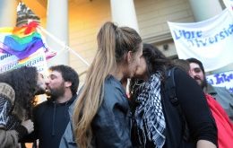 Parejas de hombres y mujeres realizaron hoy el «besazo» frente a la Catedral Metropolitana para expresar su repudio a la discriminación y para conmemorar el «Día Internacional contra la discriminación por orientación sexual e identidad …