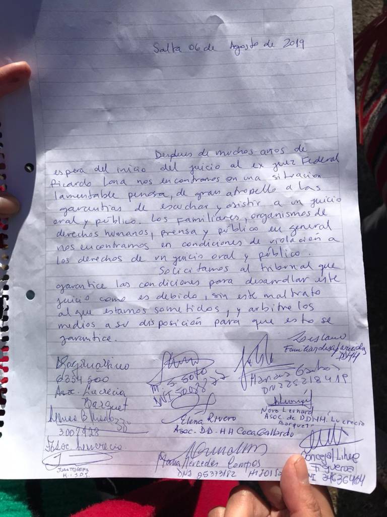 «Presentamos la nota sin demasiadas esperanzas porque parece que està todo determinado para que no asistamos al juicio,pero si, los familiares de Lona que estàn sentados en primera fila,cosa que no hemos podido hacer nosotrxs.»concluyò.