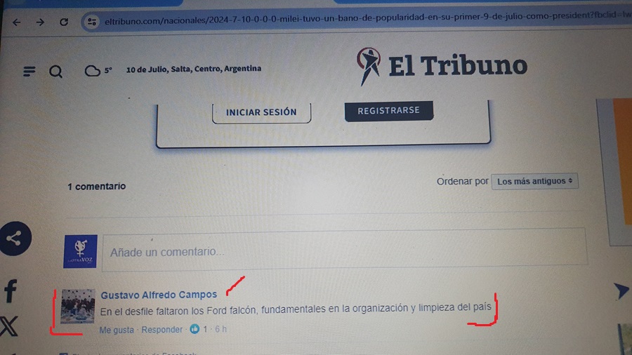 El procurador general, Pedro García Castiella, al tomar conocimiento de dicho comentario realizado al pie de la nota periodística publicada por el diario El Tribuno en su edición digital de este miércoles 10 de julio, titulada «Milei tuvo un baño de popularidad en su primer 9 de julio como presidente», dispuso que se remitan las actuaciones al Fiscal Penal que por turno corresponda para su intervención y efectos que estime corresponder.