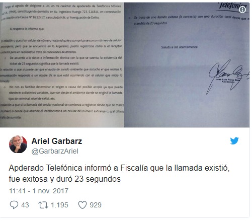 El perito Ariel Garbarz publicó en redes sociales el archivo que el 18 de agosto la empresa de comunicaciones presentó ante la fiscalía, donde el apoderado de la multinacional deja asentado que el teléfono de Santiago Maldonado fue efectivamente atendido el 2 de agosto.
